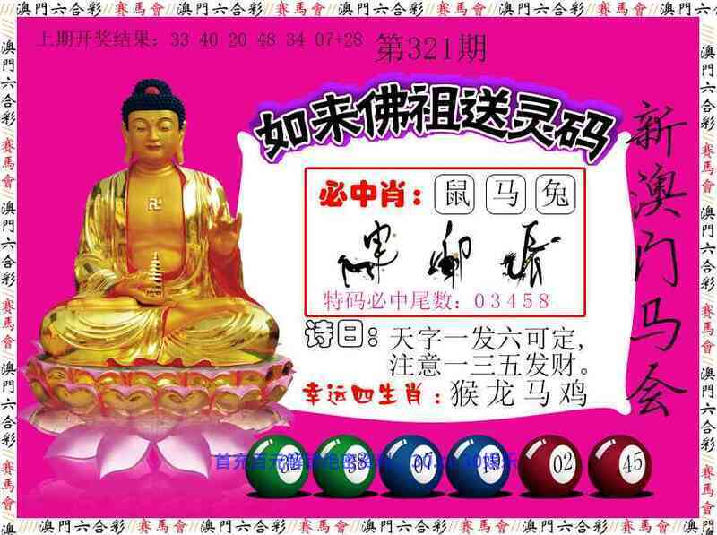 323期解佛祖送灵码图 诗日:三五成群一起来,蓝蓝绿绿蓝为主 解送七肖:猴羊牛鸡马兔鼠 幸运四生肖:猴羊牛鸡 开:鸡09准 |